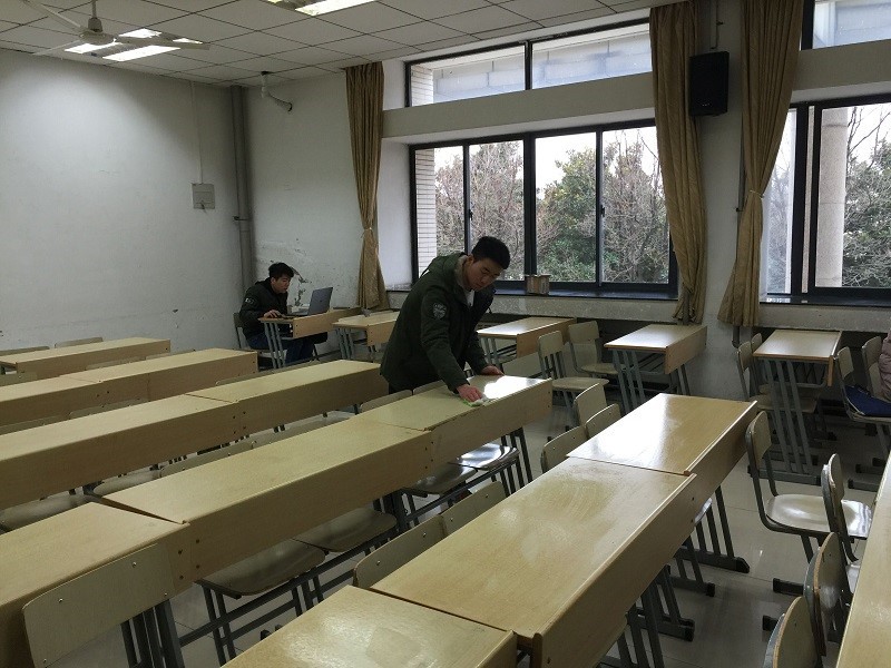 3月18号13:50,南湖校区各院青年志愿者协会参与活动的志愿者们在青春广场集合。主持人简单介绍了本次活动的内容,接着由机电青协志愿者代表阐述了本次活动实行意义。同时本次活动有幸邀请到机电学院大一辅导员张婉秋老师作为嘉宾致辞,她就考试诚信方面对同学们教导:“大学生应该对本身的学习和生活负责,而考试的诚信是一个人基本品质的反应,对个人的素质发展有很大影响。而且在学生服务手册中关于考试作弊的惩罚也很严重,希望同学们严于律己”。昌湖物业、红罡物业的负责人也都对本次课桌清理活动给予了高度赞扬和支持。接着,志愿者代表宣誓,并进行诚信考试签名仪式,同学们对活动有了更深的参与感和使命感。最后,由张婉秋老师宣布课桌清理活动正式开始,各志愿小分队在负责人的带领下到各自的区域进行了课桌整理打扫活动。