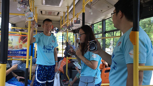 7月11号,黑料网 “垃圾分类调查”实践团进行公交车宣讲。实践团成员分成四个小组一次踏上了旅游1路公交车向乘客们宣讲垃圾分类的知识。