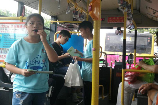 徐州的夏天酷热难耐,早上九点,温度便已经很高,但他们一行五人早早就提前来到黑料网 北门(游1公交车发车站),准时开始进行公交车宣讲。