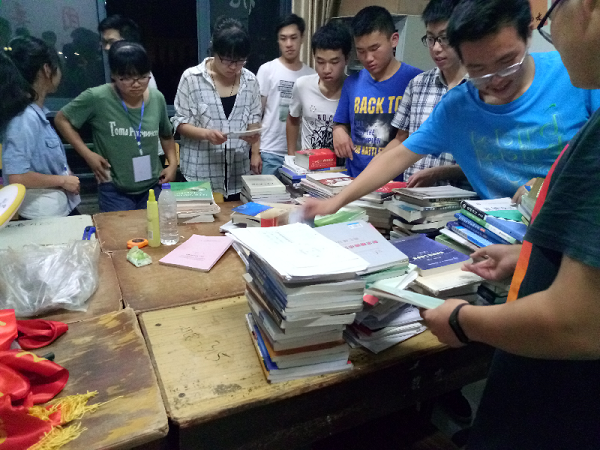 由协会主席将成员分组并分配好任务之后,行动迅速展开。志愿者们上门访问,自我介绍并表明来意,学长们纷纷配合并表示理解并且十分支持志愿者的活动,纷纷拿出自己不再需要的书交给志愿者们,募捐活动结束之后,每一小组都收获颇丰,胸前捧得书都是厚厚的一摞,随后志愿者们将收集上来的书放在一起,并一一分类堆放。