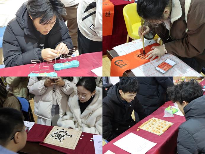 活动现场热闹非凡,各类游艺项目精彩纷呈。在趣味投壶区,同学们纷纷尝试将箭矢投入壶中,体验古代雅趣,感受传统文化的魅力;在成语接龙区,同学们更是积极思考、妙语连珠,展现出扎实的语言功底。歌词接龙和你画我猜环节则充满了欢声笑语,考验了同学们的团队协作能力;电动迷宫也作为一种充满挑战的游戏,让同学们体验了冒险的乐趣。随后的猜灯谜和知识问答吸引了众多参与者,大家互相探讨,沉浸在知识的海洋中。此外,套圈和“21点”等游戏,也令同学们在游戏中放松身心,享受了节日的快乐。最后,写春联环节更是将活动推向了高潮,同学们挥笔洒墨,一气呵成,将美好祝愿凝聚在春联上,为即将到来的新年增添了喜庆氛围。