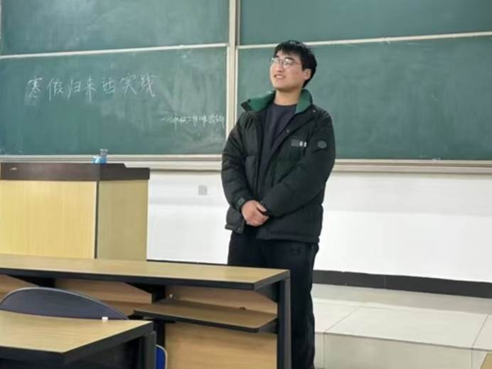首先,团支书王玺焰回顾了上学期班级的整体情况,并对新学期的班级工作和学习目标提出了明确规划,鼓励同学们在新的学期勇于挑战自我。随后,柴梦哲和赵志鹏同学作为寒假实践代表,分别分享了自己的独特经历。柴梦哲参加了“母校行”活动,他带着对高中母校的深厚情谊和大学生活的感悟重返校园。在分享中,他详细讲述了向学弟学妹们介绍大学生活的丰富多彩、分享学习经验和高考备考技巧的过程。他提到,这次活动不仅帮助母校的同学们更好地了解了大学生活,也锻炼了自己的沟通和表达能力。赵志鹏则参与了“三下乡”实践之场馆里的思政课活动。他参观了家乡党史教育馆,通过珍贵文物和历史资料,深入了解了中国共产党的发展历史,感受到先辈们的奋斗精神。他说,这次实践让自己更加坚定理想信念,明确青年的责任与担当。